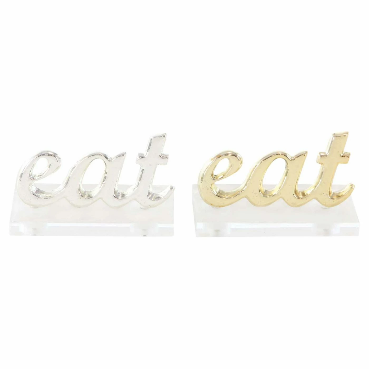 Increase the elegance of your dining room or kitchen with the DecMode Eat Decorative Sign Figurine – Set Of 2. The set provides gold and silver typography figurines cast out of durable aluminum. Clear acrylic bases keep the signs upright on your shelf, sideboard, counter, or table.