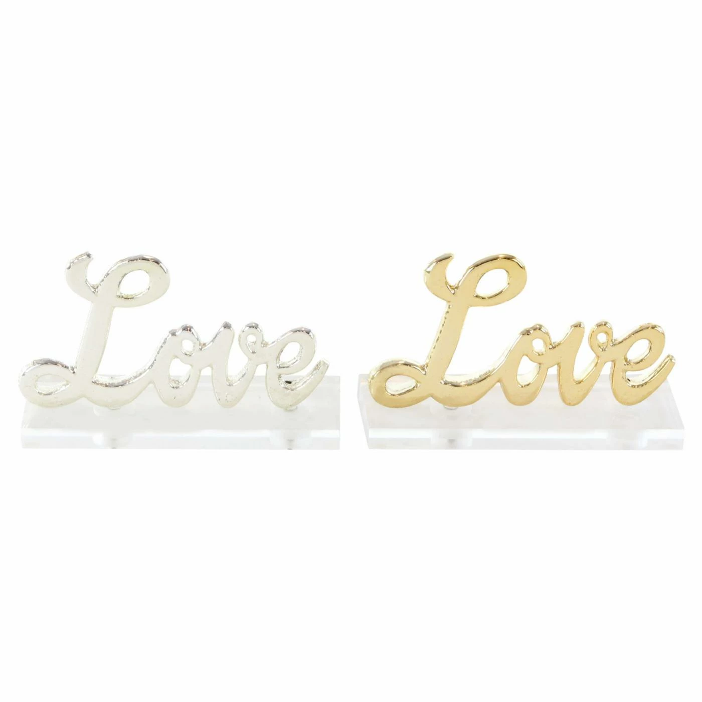 Set the mood for romance with the DecMode Love Decorative Sign Figurine – Set Of 2. Acrylic bases allow the typography signs to stand up on their own atop a table, shelf, or desk. The figurines spell out the word love in elegant script, cast out of silver- and gold-finished aluminum.